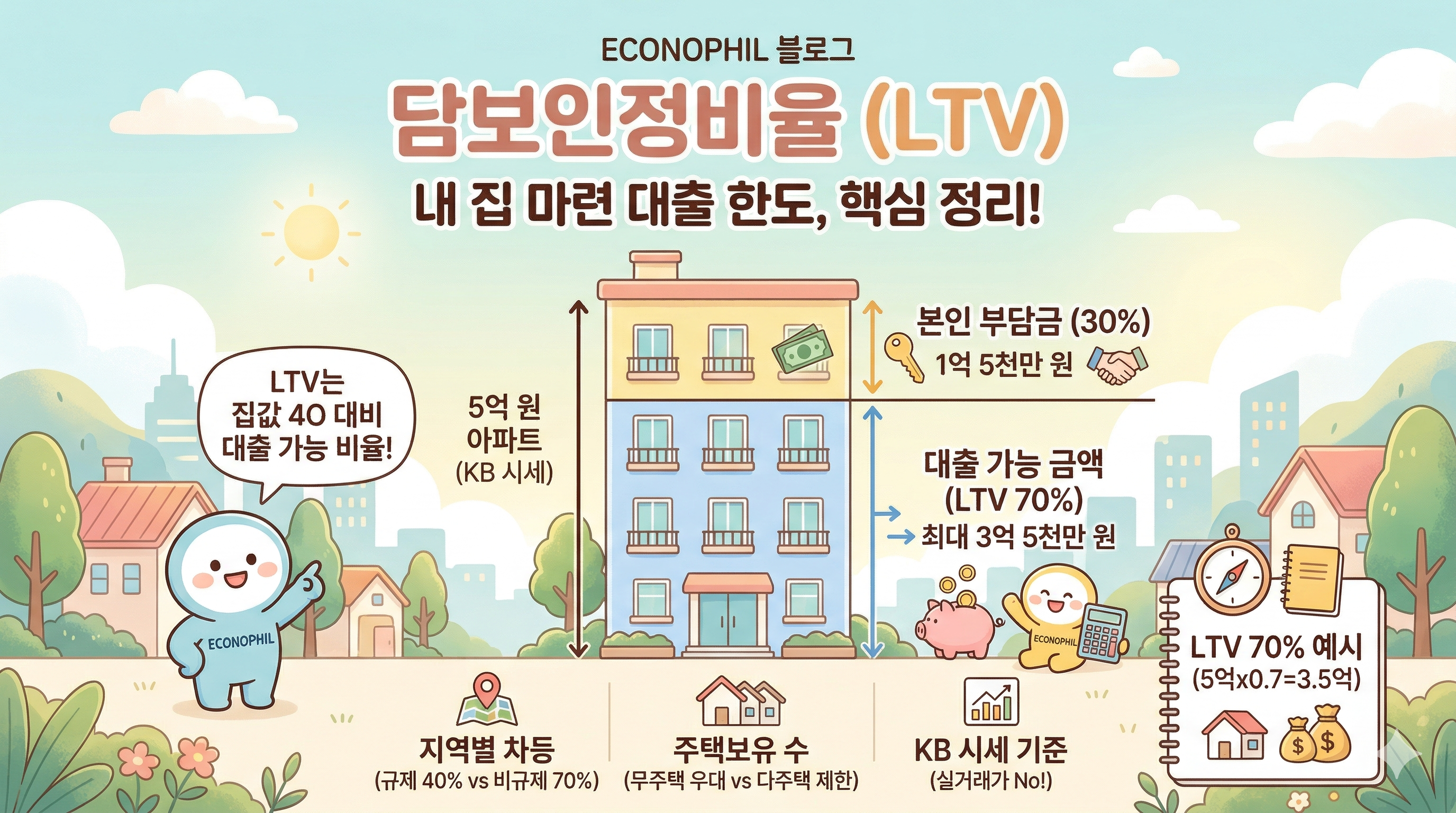 내 집 마련 전략의 핵심은 "내가 가진 돈 + 빌릴 수 있는 돈"의 정확한 합계를 아는 것입니다. 오늘 담보인정비율을 확실히 마스터하셨으니, 이제 큰 산 하나를 넘으신 거예요. :)