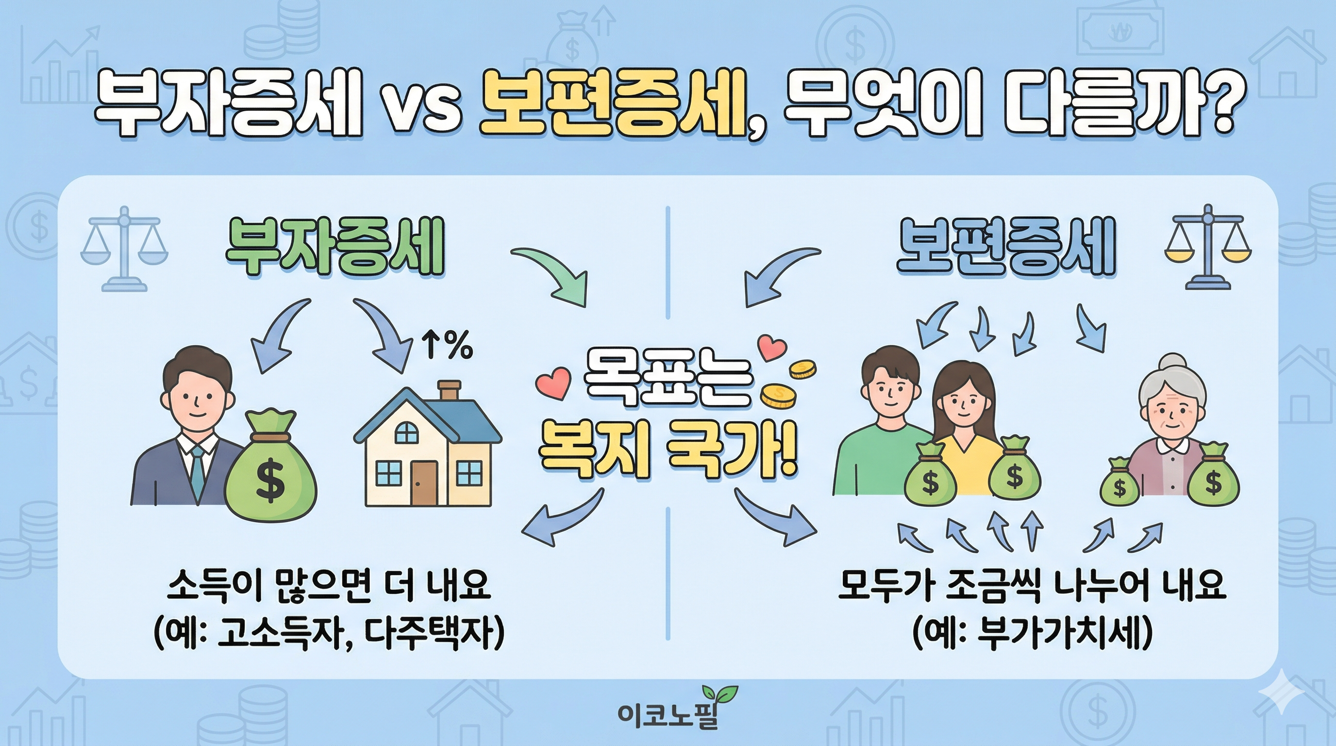 부자증세와 보편증세, 목표는 같아요. 나라 살림을 늘려 복지나 공공서비스를 더 잘하자는 거죠. 다만 "누구 주머니에서 걷느냐"가 다릅니다.